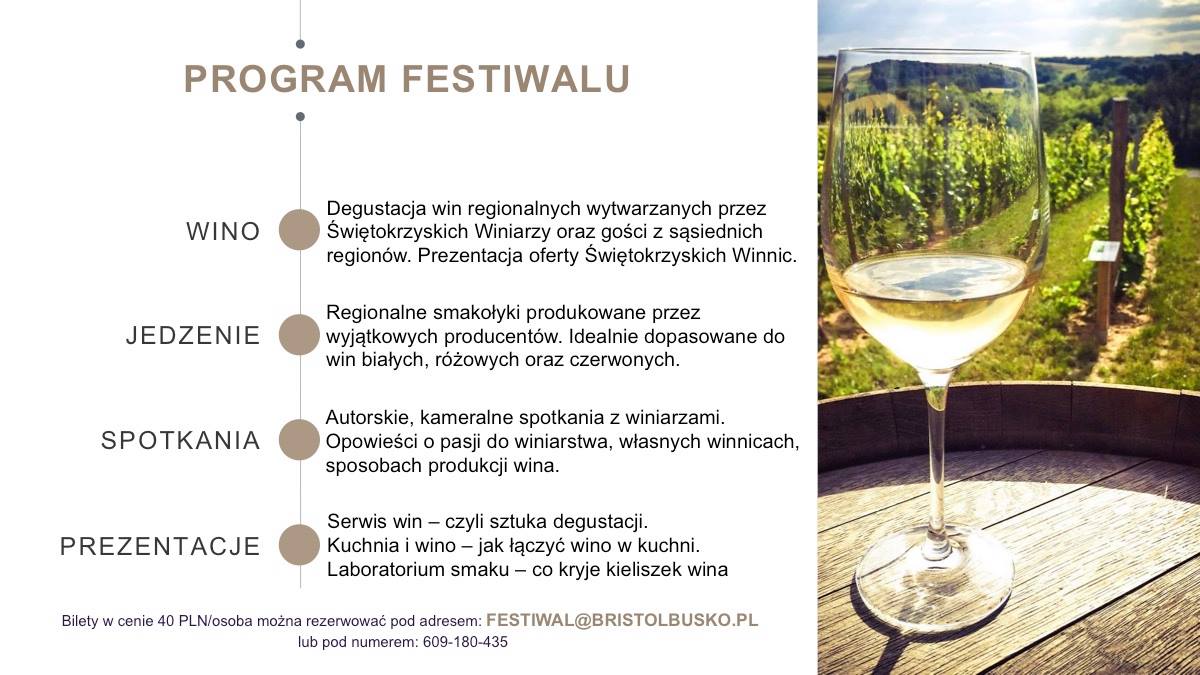 W regionie świętokrzyskim znajdziecie najlepsze wina w Polsce. By ich skosztować zapraszamy Was 5 Sierpnia na Świętokrzyski Festiwal. Oprócz najlepszy regionalnych win będziecie mogli zasmakować regionalnych serów, długodojrzewajcych wędlin i wielu innych wytworów lokalnych producentów.